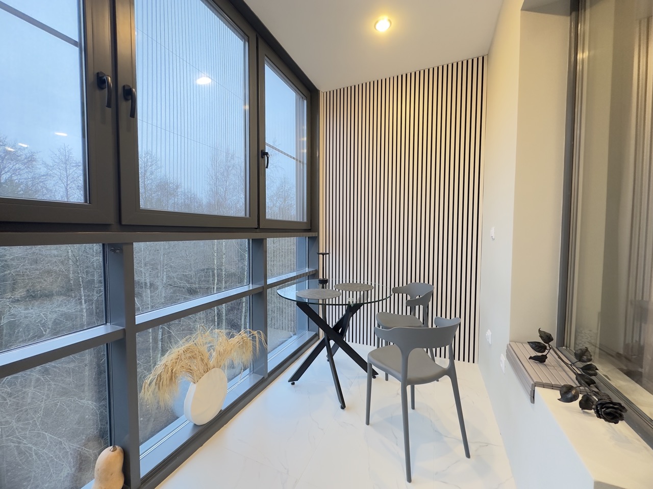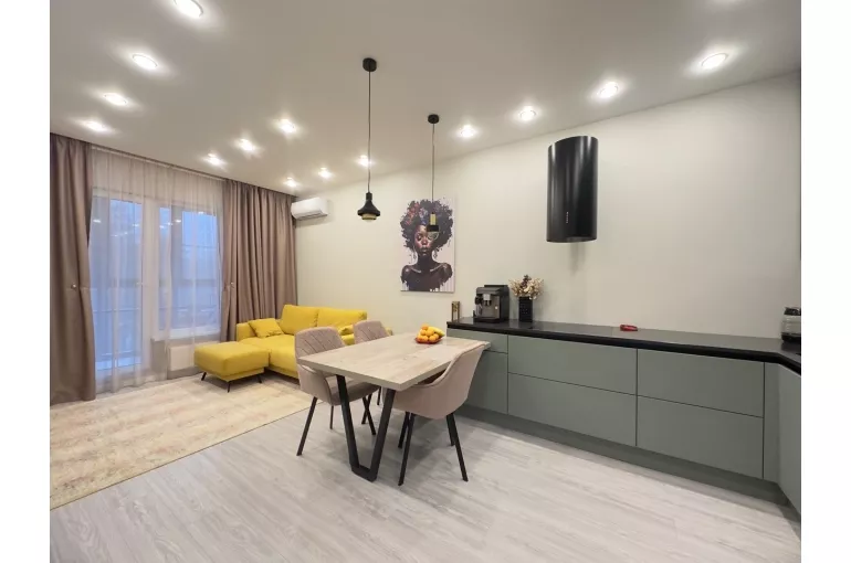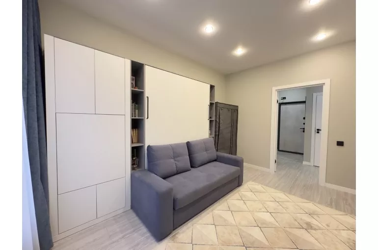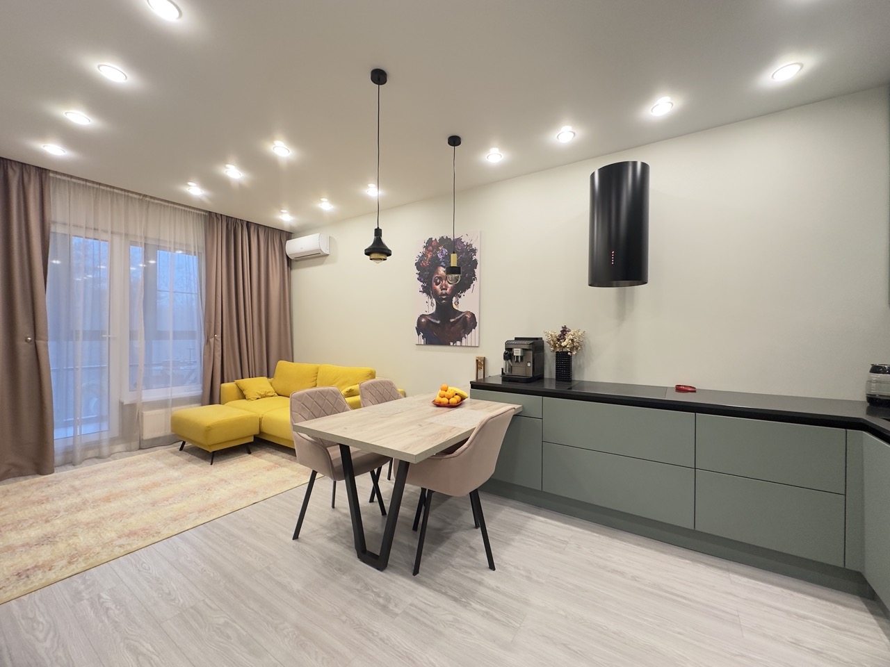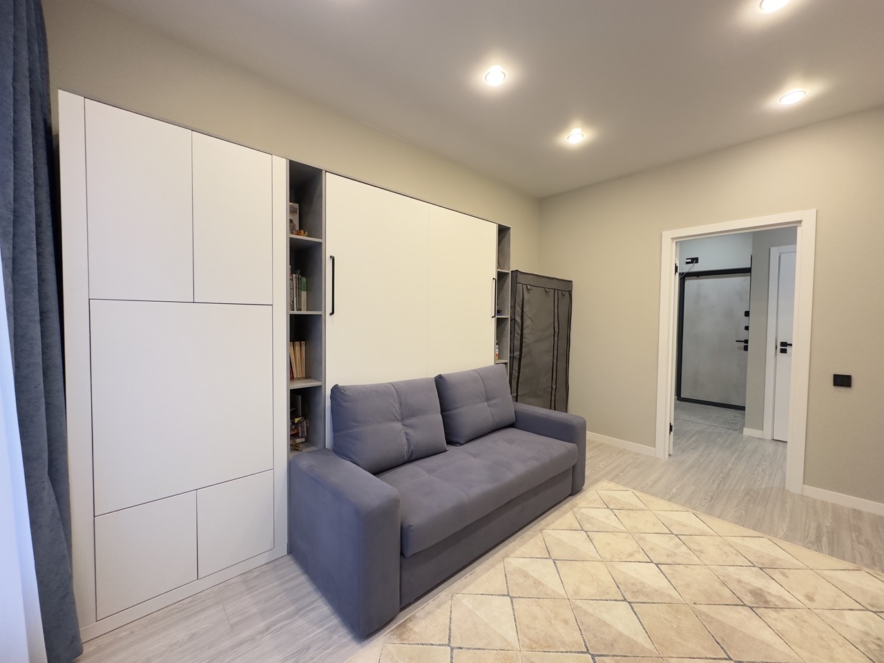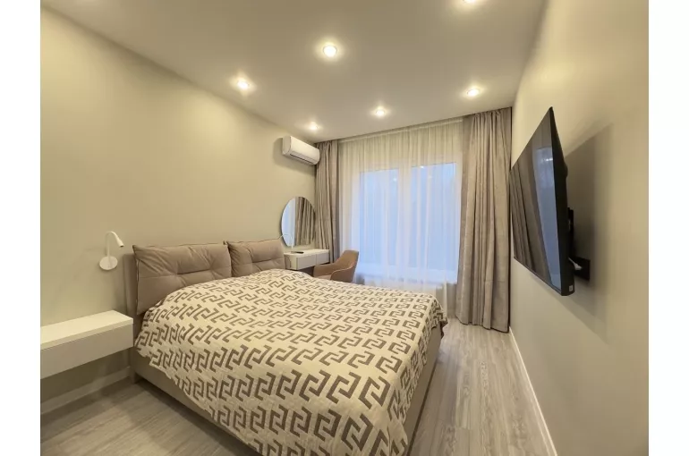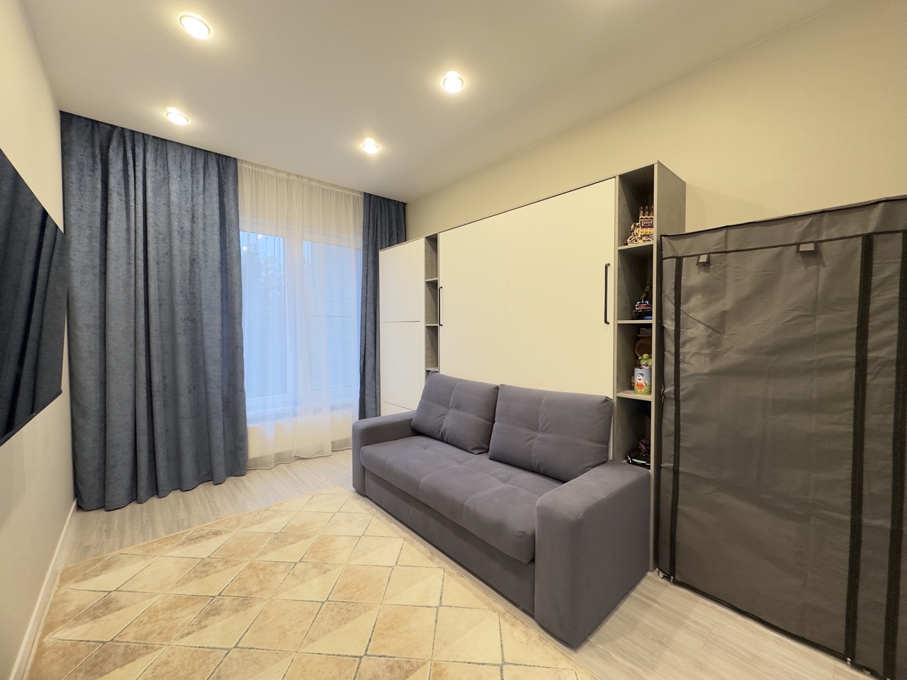 Отделка: Чистовая отделка с мебелью, в комплект входит кухонный гарнитур от премиального производителя – мебельной фабрики «Мария» с техникой. Мебель в детской (трансформер – превращается в рабочее место и широкую удобную кровать) и мебель в спальне оговариваются отдельно. Широкая утепленная лоджия оснащена теплым полом. В квартире установлена Сплит система кондиционирования, система умного дома.
